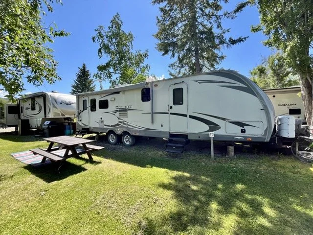 Enjoy the full camping experience without having to pull your own Trailer! Trailer 3 is a fully equipped on-site RV and is centrally located — enjoy being close to the lake, washrooms, games field, and all resort amenities.